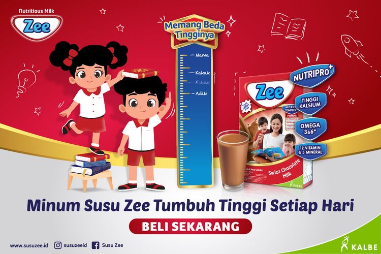 Susu Zee diperkaya dengan Nutripro-Complex + dengan kandungan 9 asam amino esensial, tinggi kalsium, kolin, protein, omega 3 dan 6, serta vitamin B kompleks untuk pertumbuhan tinggi badan dan kecerdasan anak.