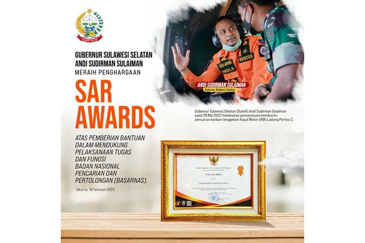 Gubernur Sulawesi Selatan (Sulsel) Andi Sudirman Sulaiman menerima penghargaan SAR Awards dari Badan Nasional Pencarian dan Pertolongan (BNPP/Basarnas).