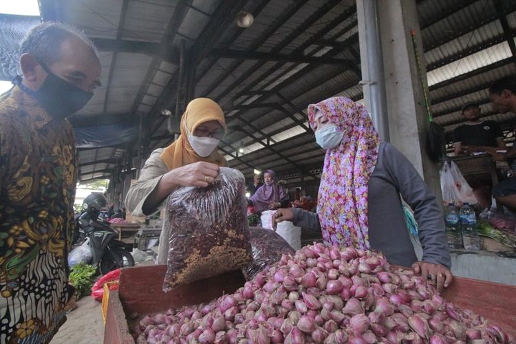 Kepala Dinas Ketahanan Pangan dan Peternakan (DKPP) Kabupaten Kediri Tutik Purwaningsih saat melakukan pengecekan kenaikan harga bahan pokok langsung terjun ke pasar.
