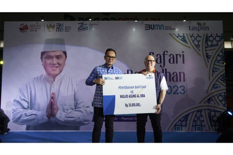 Penyerahan bantuan oleh Taspen dalam kegiatan Safari Ramadhan BUMN 2023.