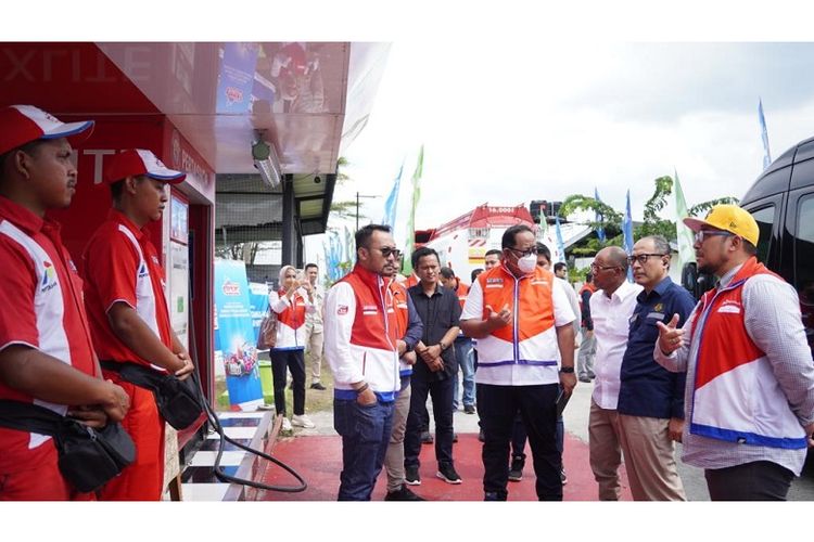 Direktur Pemasaran Regional Pertamina Patra Niaga Mars Ega Legowo Putra bersama Direktur Jenderal (Dirjen) Minyak dan Gas Bumi (Migas) Kementerian Energi dan Sumber Daya Mineral (ESDM) Tutuka Ariadji saat meninjau salah satu SPBU di Tol Trans-Jawa. (Dok. Pertamina)