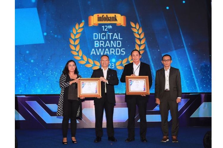 Senior Vice President KPR and KKB Bank BJB Triastoto Hardjanto Wibowo dan Deputy Digital Banking Bank BJB Johanes Parulian Tamba menerima penghargaan pada 12th Infobank Digital Brand Recognition 2023 yang diselenggarakan di Shangri-La Hotel, Jakarta Pusat, Rabu (12/4/2023).