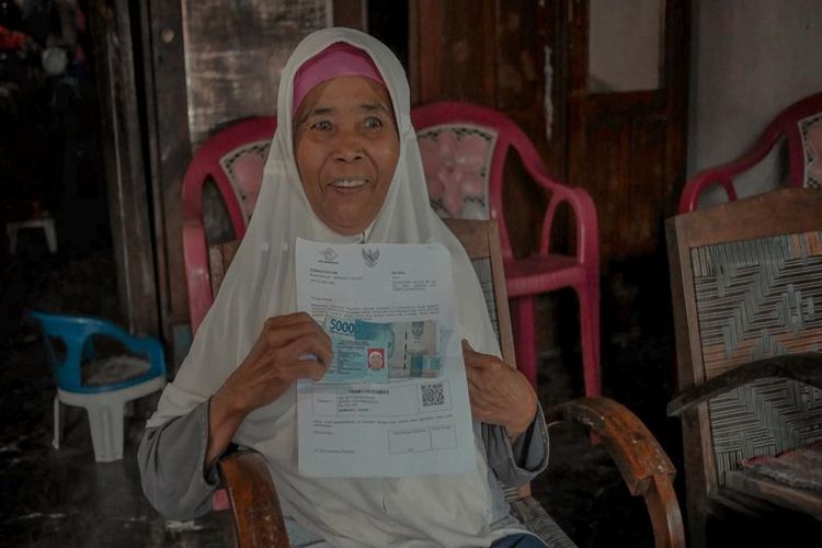 KPM penerima bantuan ialah Sati. Lansia yang berdomisili di Bondowoso, Jawa Timur (Jatim) ini telah berusia lebih dari 70 tahun. Bantuan ini dipakai untuk beli beras, ikan, gula, kebutuhan dapur. Ia berharap, bantuan bisa ada setiap bulan. (Dok. Pos Indonesia)