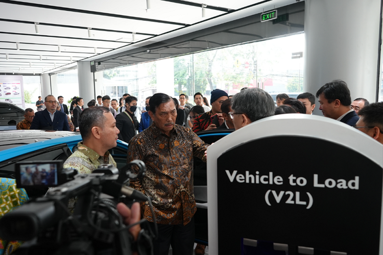 Menteri Koordinator Bidang Kemaritiman dan Investasi, Luhut Binsar Pandjaitan mencoba MG4 EV dengan fitur canggih Vehicle to Load (V2L).