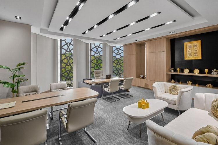 Tampilan mock up ruang kantor yang luas, eksklusif, serta mewah dengan floor-to-ceiling window.