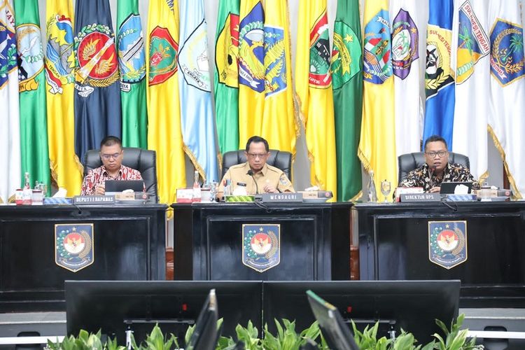 Menteri Dalam Negeri (Mendagri) Muhammad Tito Karnavian dalam Rapat Koordinasi (Rakor) Pengendalian Inflasi Daerah yang berlangsung secara hibrida di Gedung Sasana Bhakti Praja (SBP) Kantor Pusat Kementerian Dalam Negeri (Kemendagri), Jakarta, Senin (19/6/2023).(Dok. Kemendagri)