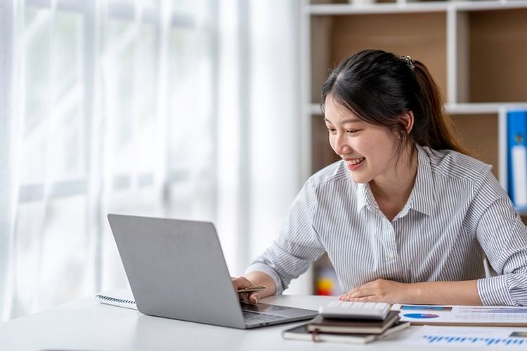 Ilustrasi seorang karyawati sedang melakukan monitoring keuangan perusahaan.