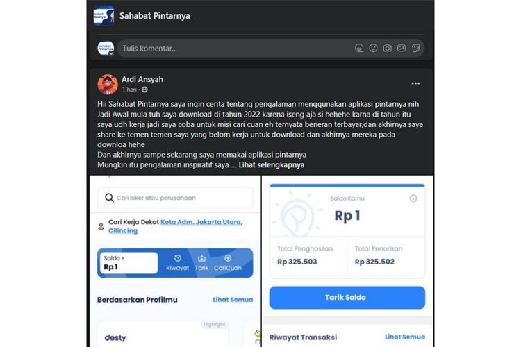 Unggahan Ardi Ansyah di Facebook yang menyatakan bila dirinya berhasil mendapatkan uang melalui platform Pintarnya.