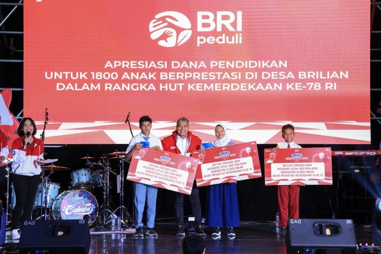 Direktur Utama BRI Sunarso bersama tiga perwakilan pelajar berprestasi Desa BRILian yang menerima beasiswa BRI.