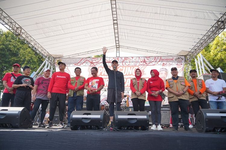 Gubernur Jawa Tengah (Jateng) Ganjar Pranowo saat menghadiri acara pengukuhan ribuan relawan kebencanaan desa se-Kabupaten Klaten di Alun-alun Kabupaten Klaten, Jateng, Jumat (1/9/2023).