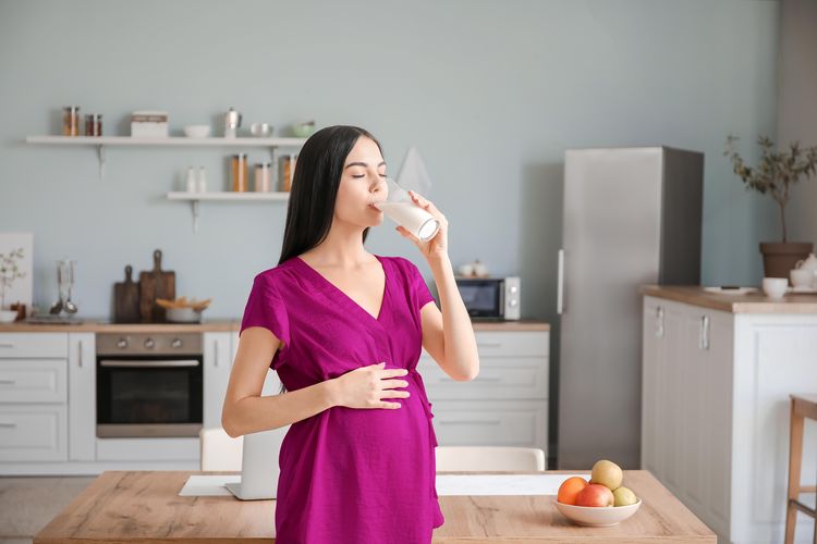 Ilustrasi ibu hamil mengonsumsi susu sebagai sumber protein.