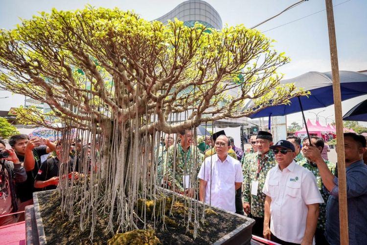 Menkop dan UKM Teten Masduki (kedua dari kanan) sedang menyaksikan hasil kreativitas pembudi daya bonsai yang dipamerkan di Munas Ke-10 PPBI.