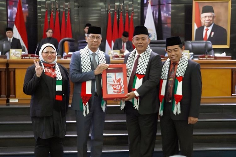 Penyerahan Dokumen Perda APBD secara simbolis dalam rapat paripurna DPRD DKI Jakarta. (Dari kiri) Wakil Ketua DPRD DKI Jakarta Rany Mauliani, Pj Gubernur DKI Jakarta Heru Budi Hartono, Ketua DPRD DKI Jakarta Prasetyo Edi Marsudi, Wakil Ketua DPRD DKI Jakarta Khoirudin. (Dok. DPRD DKI Jakarta)