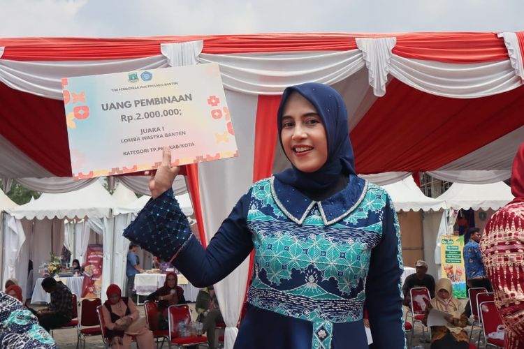 Ketua Tim Penggerak Pemberdayaan Kesejahteraan Keluarga (TP-PKK) Kota Cilegon Hany Seviatry saat menerima penghargaan juara pertama pada Lomba Wastra Banten untuk kategori TP-PKK tingkat kabupaten/kota se-Provinsi Banten.