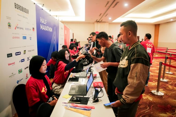 Proses registrasi ulang para pelari sebelum penyelenggaraan Borobudur Marathon 2023 Powered by Bank Jateng di kawasan Candi Borobudur, Magelang, Jawa Tengah.