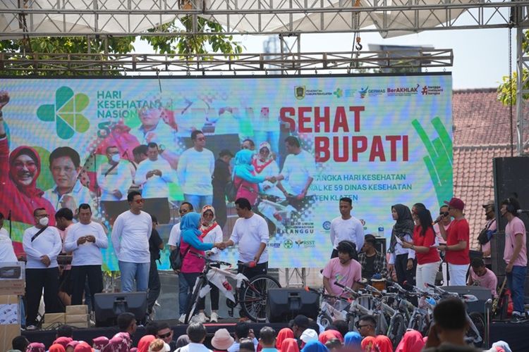Bupati Klaten Sri Mulyani mengikuti senam bersama nakes se-Kabupaten Klaten dalam rangka memperingati Hari Kesehatan Nasional Ke-59 di Alun-alun Klaten, Jateng, Sabtu (18/11/2023).