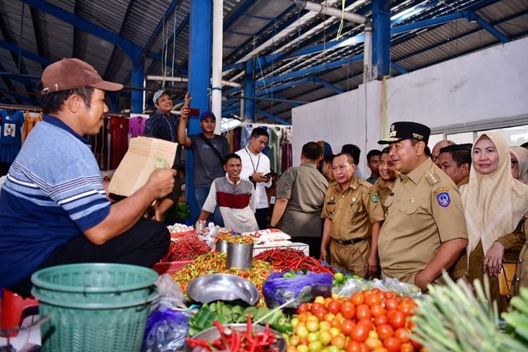 Pj Gubernur Sulsel Bahtiar Baharuddin meninjau harga kebutuhan pokok di Pasar Tradisional Batangase, Kecamatan Mandai, Kabupaten Maros, Sulsel, Selasa (21/11/2023).
