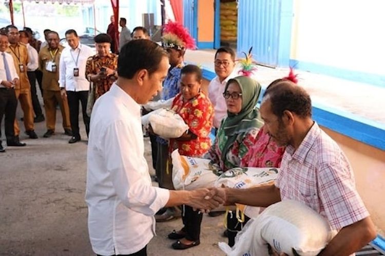 Presiden Jokowi memberikan langsung bantuan pangan beras tahap II kepada 1.000 keluarga penerima manfaat (KPM) di Gudang Bulog Mandala, Biak Numfor, Papua, Rabu (22/11/2023) (Dok. Bulog)