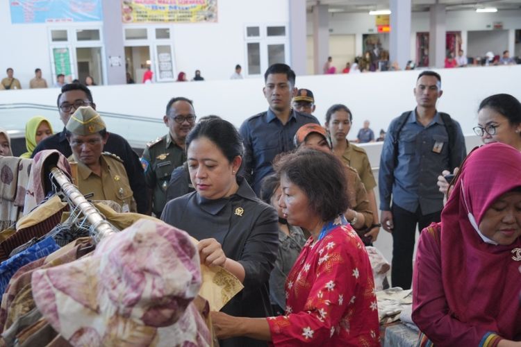 Ketua DPR RI Puan Maharani melihat produk yang dipasarkan di Pasar Gedhe Klaten.