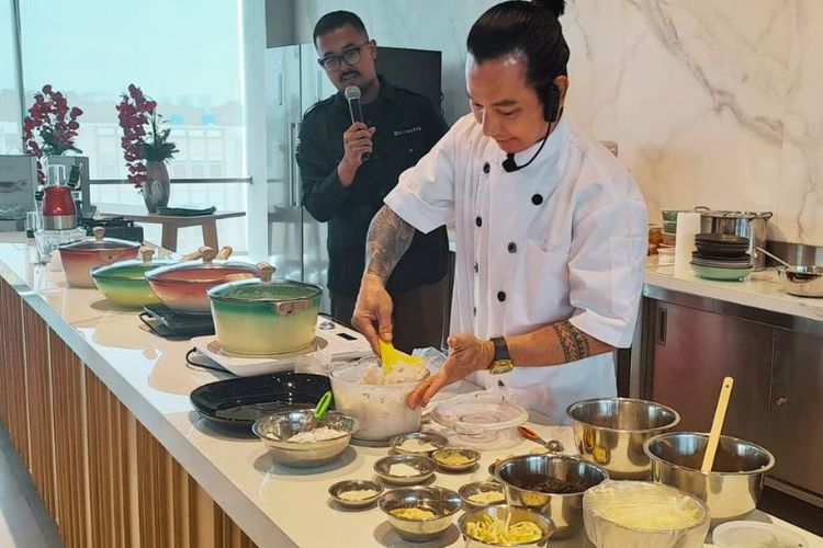 Chef Eddy Siswanto mendemokan cara memasak tekwan yang sedap nan umami dalam acara Private Lunch and Cooking Demo Exclusive yang digelar Ecohome Indonesia. Bagi Chef Eddy, kunci utama hidangan tekwan adalah ikan tenggiri segar untuk menghasilkan tekwan yang nikmat.(Dok. KOMPAS.com/Yakob Arfin)