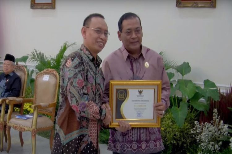 Pemberian penghargaan sebagai Badan Publik Informatif Kategori Perguruan Tinggi kepada Rektor Unair Prof Dr Mohammad Nasih, SE, MT, Ak di Istana Wakil Presiden, Jakarta, Selasa (19/12/2023). (Dok. Unair)