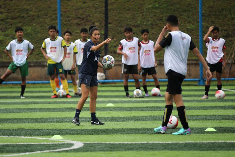 Senior Global Development Football Coach for Tottenham Hotspur Football Club Shannon Moloney menyampaikan instruksi kepada sebagian pemain bola peserta Liga Kompas Kacang Garuda U-14 (LKG U-14) di Dewantara Sport Center, Tangerang Selatan, Banten, Sabtu (27/1/2024). (KOMPAS.ID/HERU SRI KUMORO)