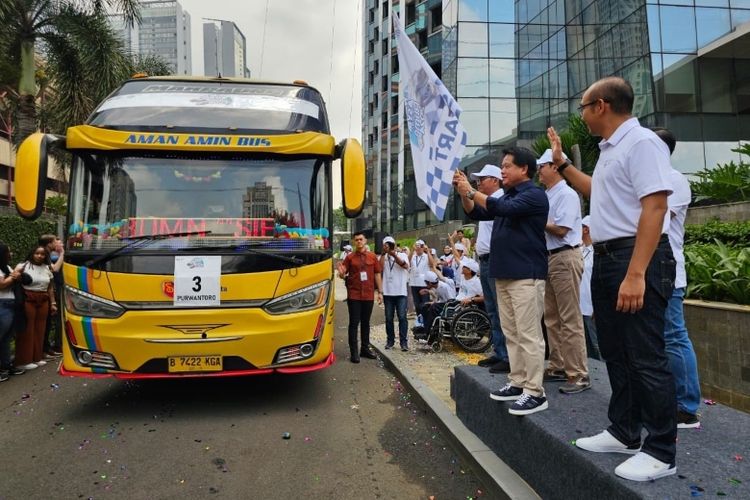 Direktur Utama BSI Hery Gunardi (kanan kedua) didampingi Direktur Manajemen Risiko BSI Grandhis Helmi Harumansyah (kanan pertama) melakukan flag off pelepasan peserta Mudik Asyik Bersama BUMN dan BSI 2024 di Kantor Pusat BSI, Gedung The Tower Jakarta, Jumat (5/4/2024). Tahun ini BSI memberangkatkan sebanyak 644 pemudik, dengan total 15 armada bus, termasuk 3 bus yang diperuntukkan bagi penyandang disabilitas untuk bersilaturahmi di kampung halaman pada momen Hari Raya Idul Fitri 1445 H.(Dok. BSI)