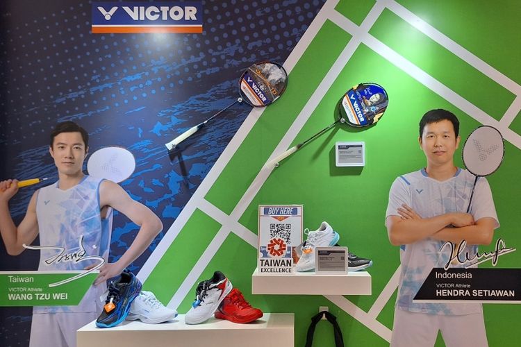 Merek peralatan badminton, VICTOR, juga ditampilkan.