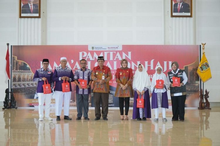 Bupati Klaten Sri Mulyani bersama Wakil Bupati Klaten Yoga Hardaya menyerahkan bekal kepada perwakilan KBIH dari 1.155 calon haji dan perwakilan petugas haji di Grha Bung Karno, Klaten, Jawa Tengah, Rabu (29/5/2024)