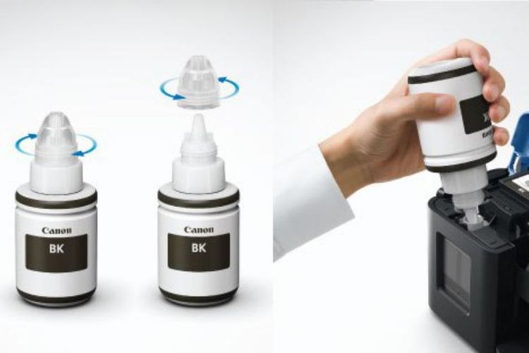 Botol tinta didesain praktis agar mudah dituang ke dalam tangki printer dan mencegah tintah tumpah.