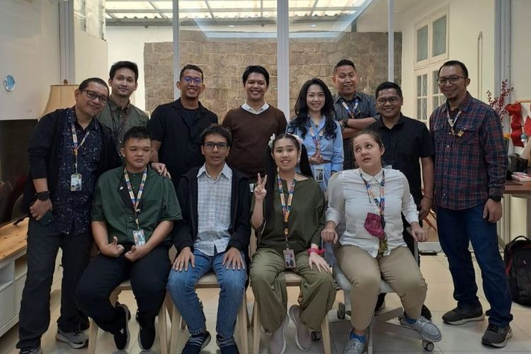 Di baris depan merupakan empat sekawan seniman neurodiversitas yang dibina serta bekerja di Yayasan Filoksenia. Mereka adalah Athalia Fikri Yanis, Ara Putra Fadillah, Claire Nicole Stephanie S, dan Calliandra Alexa Roshetko.(Dok. KOMPAS.com/Yakob Arfin)