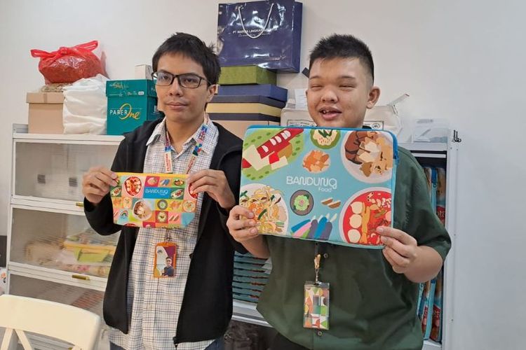 Athalia Fikri Yanis dan Ara Putra Fadillah memperlihatkan produk desain yang dielaborasi bersama lewat media sleeve case laptop dan pouch.