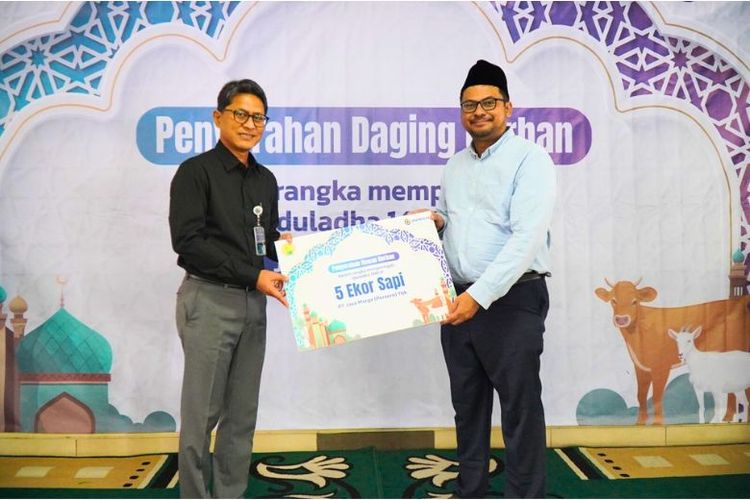 Acara seremonial pembagian daging kurban wilayah Kantor Pusat Jasa Marga digelar di Masjid Ar-Rahman, Jakarta, Rabu (19/6/2024).