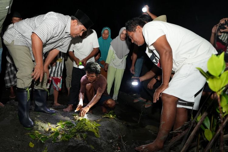 Penjabat (Pj) Gubernur Sulbar Bahtiar Baharuddin melakukan pelepasan induk-anak kepiting bakau di Dusun Lambagu, Desa Sumare, Kecamatan Simboro, Kabupaten Mamuju, Minggu (4/8/2024). (dok. Pemprov Sulbar)