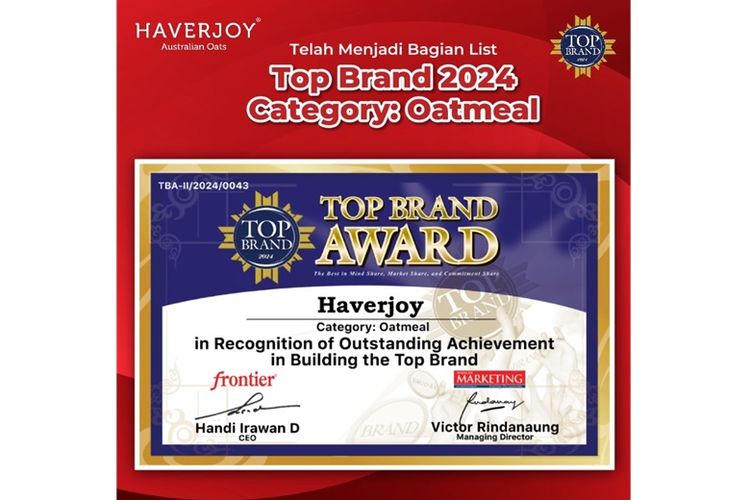Haverjoy mendapat penghargaan Top Brand Award 2024 dalam kategori Oatmeal.