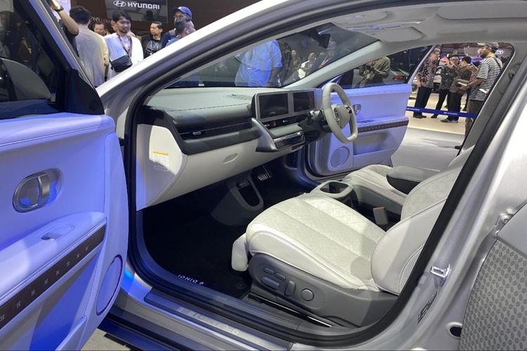 Bagian kabin IONIQ 5 Batik dihiasi pola batik Kawung berwarna abu-abu muda dengan ornamen putih dan emas.