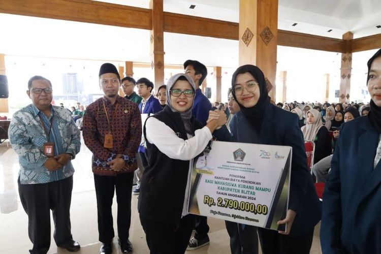 Bupati Kabupaten Blitar Rini Syarifah memberikan bantuan biaya pendidikan kepada 1.706 mahasiswa berprestasi dan kurang mampu di Pendopo Sasana Adhi Praja, Kabupaten Blitar, Jawa Timur, Kamis (22/8/2024).