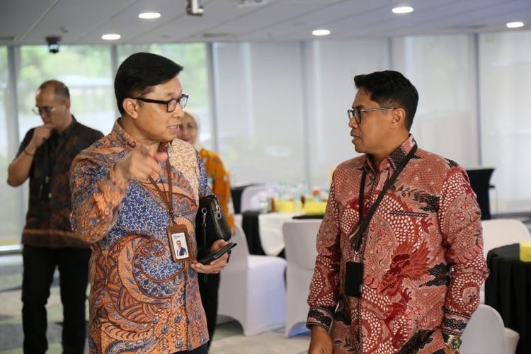 Direktur Pemasaran BRI Life Sutadi (kiri) sedang berbincang-bincang dengan Direktur Utama BRI Life Aris Hartanto (kanan).