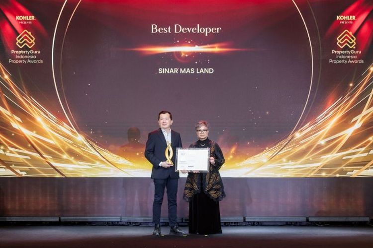 Sinar Mas Land menerima penghargaan sebagai Best Developer selama dua tahun berturut-turut, bersama dengan Vivin Harsanto, chairperson of the independent panel of judges dan senior director dan head of advisory at JLL Indonesia (Dok. PropertyGuru Group)