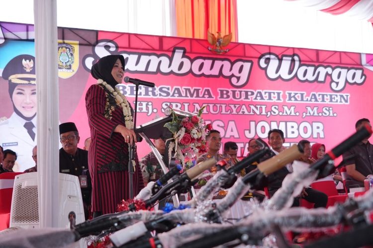 Bupati Klaten Sri Mulyani saat menghadiri acara Sambang Warga di Desa Jombor, Kecamatan Ceper, Kabupaten Klaten, Jawa Tengah, Jumat (6/9/2024).
