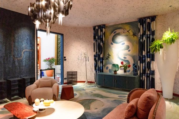 Terinspirasi dari desain studio pelukis Antonio Blanco di Ubud, Bali, Ary Juwono berkolaborasi dengan Quadra untuk membuat Serpentine Craft untuk lantai dan dinding dengan motif goresan warna-warni bak di atas kanvas.