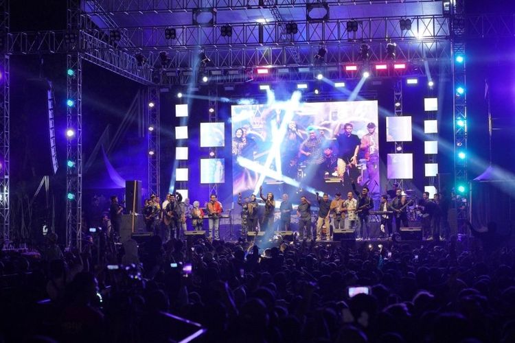Penampilan band Gildcoustic, Java Music Revolution, dan Happy Asmara memeriahkan malam puncak perayaan Hari Jadi ke-220 Kabupaten Klaten di Alun-alun Kabupaten Klaten, Jawa Tengah, Jumat (20/9/2024).