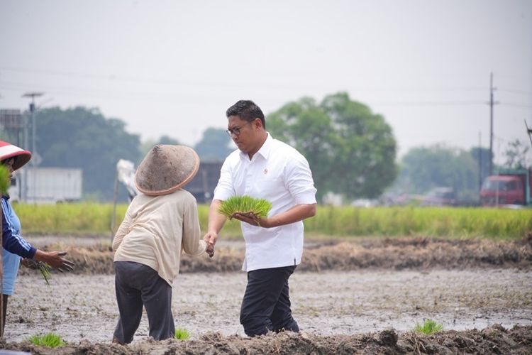 Sudaryono saat membantu petani menanam padi.