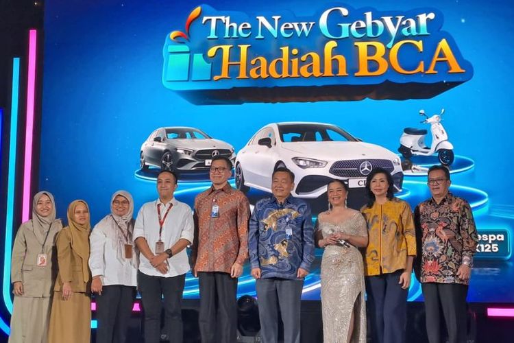 Jajaran Direksi Bank BCA, perwakilan Kemensos, Ruth Sahanaya, Dinsos DKI Jakarta, dan notaris dalam gelaran pengumuman pemenang The New Gebyar Hadiah BCA di Hotel Kempinski, Jakarta, Senin (23/9/2024).
