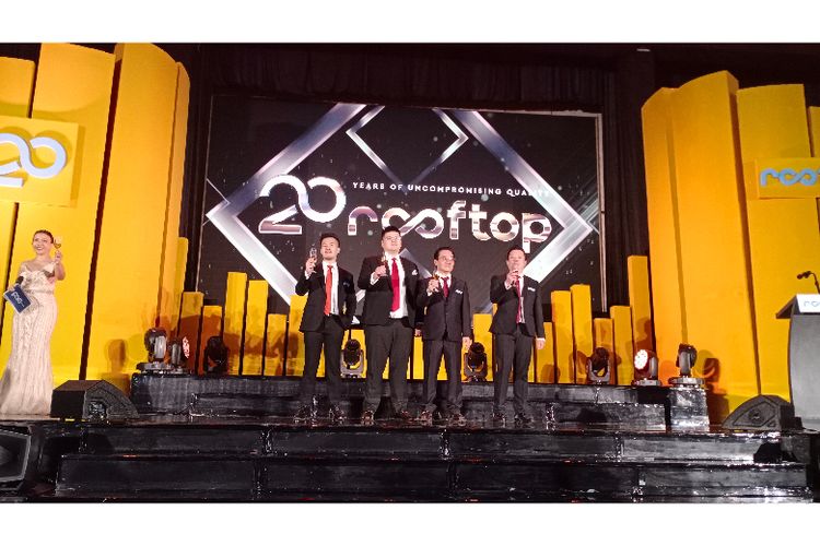 Direktur Marketing PT Sumber Djaja Perkasa, Brian Bastian Tanudjaja bersama para jajaran direktur lainnya berfoto bersama dalam Perayaan 20 tahun Anniversary Atap Dingin ROOFTOP® di Hotel Westin, Surabaya, Jawa Timur, Jumat (19/9/2024) (Dok. GHINAN SALMAN/KOMPAS.com)
