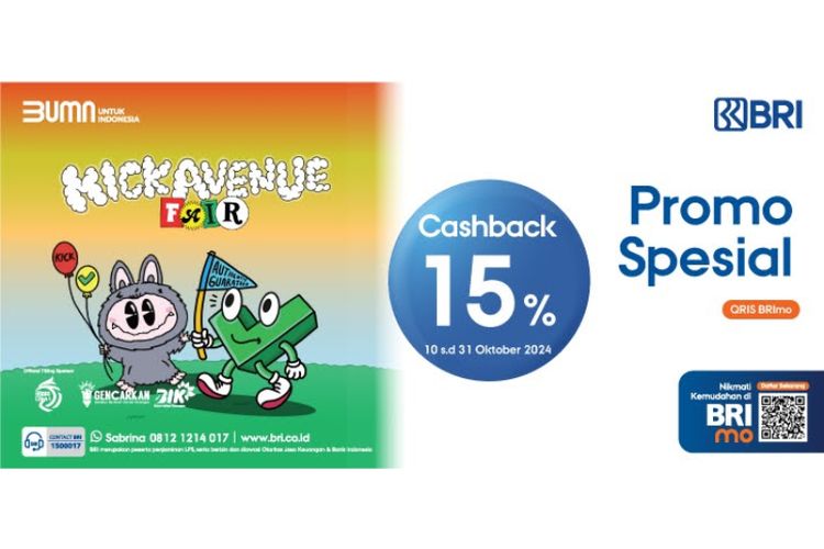 Pengguna BRImo bisa mendapatkan cashback 15 persen hingga Rp 250.000 untuk setiap transaksi minimal Rp 1.500.000 di gerai Kick Avenue yang menggunakan mesin EDC BRI. Promo ini berlaku untuk satu kali transaksi per pengguna selama periode program 10?31 Oktober 2024(Dok. BRI)