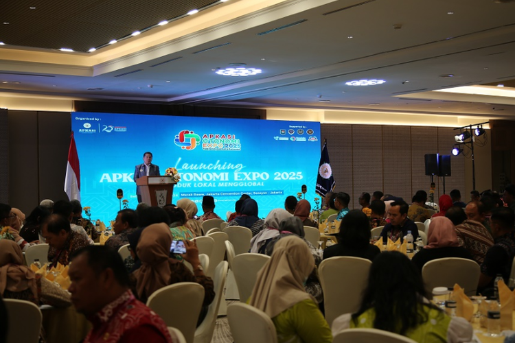 Direktur Eksekutif Apkasi Sarman Simanjorang memberi sambutan dalam peluncuran AOE 2025 di Merek Room, Balai Sidang Jakarta Convention Center (JCC), Jakarta, Selasa (22/10/2024). (Dok. Apkasi)