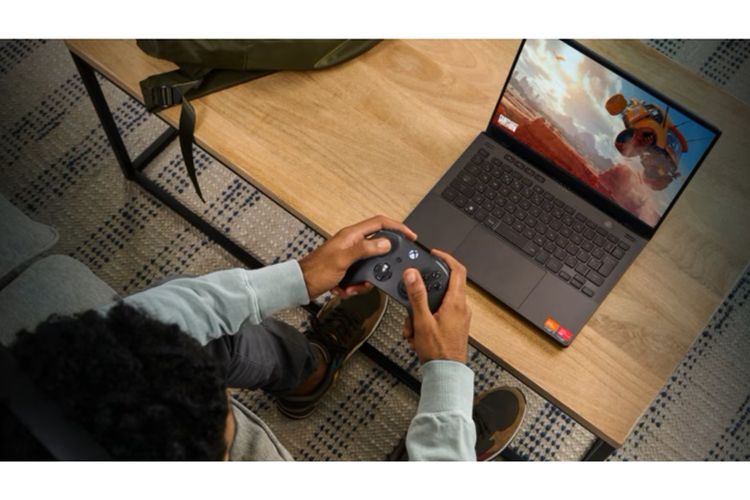 Ilustrasi bermain game di laptop.