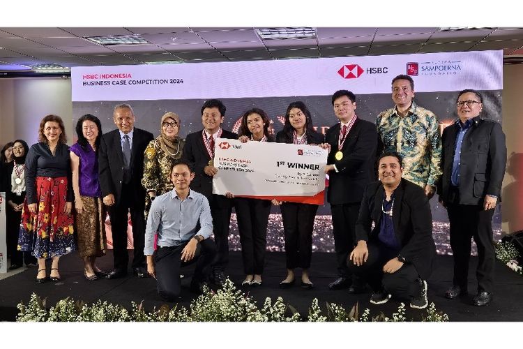 Tim pemenang HSBC Indonesia Business Case Competition 2024 berpose bersama para juri dan mentor. Kompetisi ini mengasah kemampuan kewirausahaan mahasiswa, memperkuat keterampilan masa depan generasi muda Indonesia
