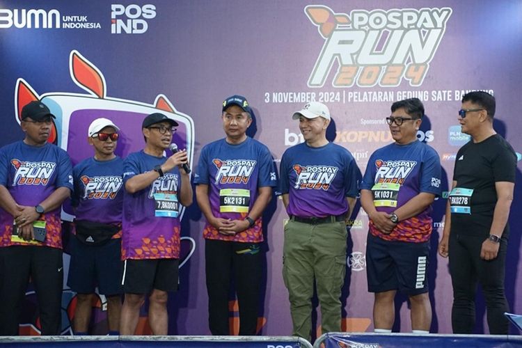 Direktur Utama Pos Indonesia Faizal R Djoemadi saat memberikan sambutan pada Pospay Run 2024.